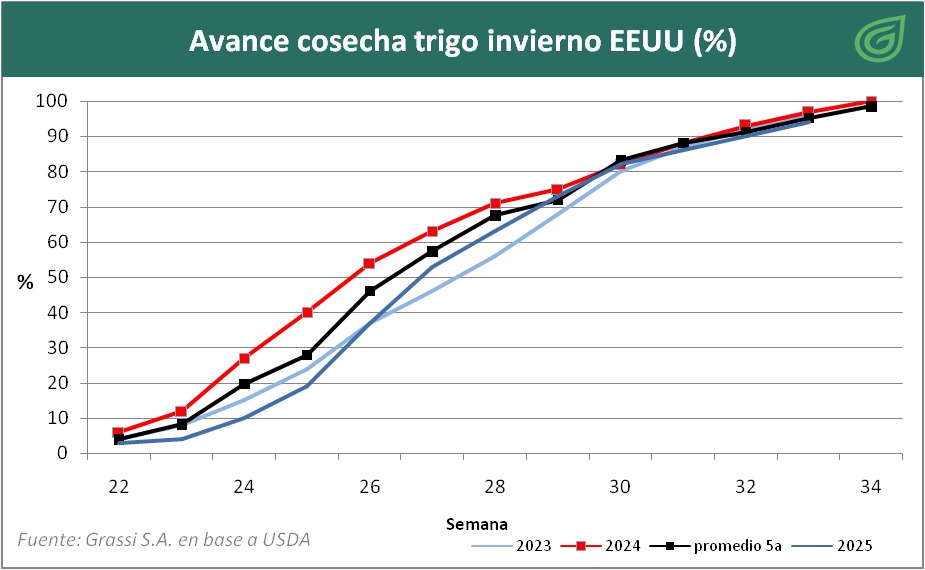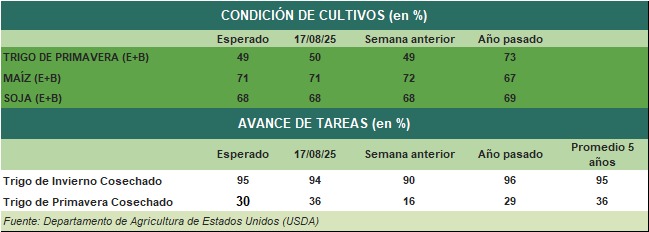 Cuarta semana de la cosecha del Trigo de primavera en EE.UU. el cual fue de 36% vs el 30% que esperaba el mercado. Adelantada en relación a la semana anterior, pero igualada en relación al promedio de los últimos 5 años.