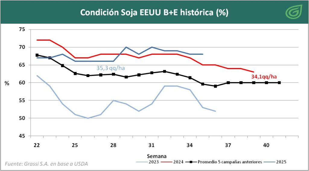 Continuamos el seguimiento de las condiciones para la oleaginosa, (E+B) las cuales fueron 68%, igual a lo que esperaba el mercado, igual a la semana anterior y ligeramente por debajo al año previo.