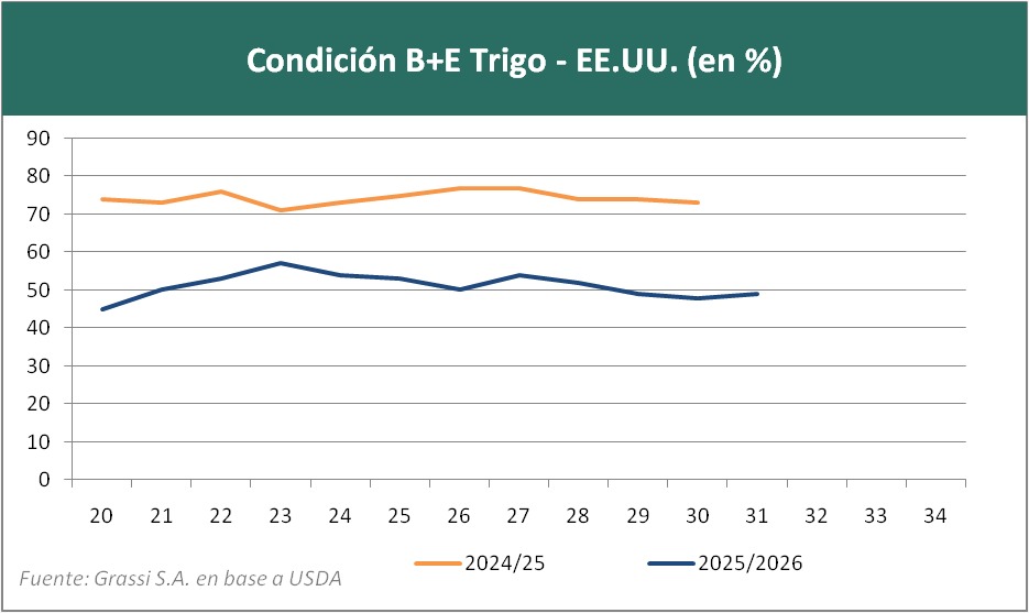 Continuamos informando las condiciones de los cultivos de primavera (E+B) la cual fue de 50%, por encima de las expectativas del mercado, 1% por arriba en relación a la semana anterior pero 23% por debajo de el año pasado.