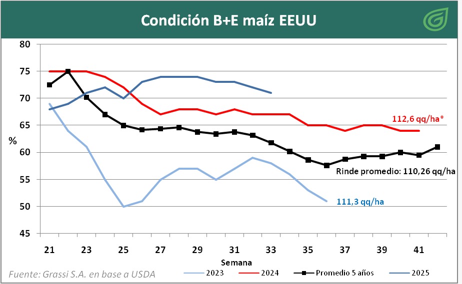 Actualizamos las condiciones de cultivo para el maíz (E+B) el cual fue de 71%, ligeramente por debajo a la semana anterior, pero mejor al año previo. Dio en línea a lo que esperaba el mercado.