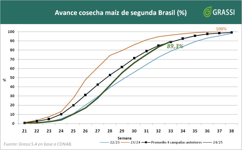 La cosecha para el maíz de segunda progresa acelerando el ritmo alcanzando el 89,3%, lo cual esta 7,3% atrasado respecto al año anterior, la brecha se acorta en relación a los datos de la semana pasada. El retraso respecto al promedio de las campañas anteriores desaparece y ya se encuentra incluso 0,6% adelantado.
