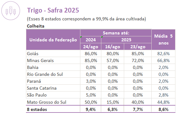 Tímido avance en las tareas, 1,7% atrasada en relación al año anterior, la brecha se acrecienta aunque de manera ligera. Con respecto al promedio, el atraso es solo de 0,9%. Goiás y Minas Gerais muestran los progresos. La región de Mato Grosso do Sul se encuentra atrasada en cuanto a la cosecha. Sin embargo, avanzo del 15% al 40% en una semana.