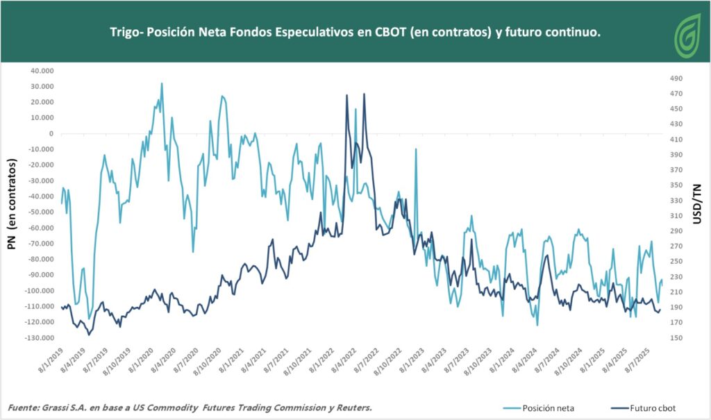 En términos totales, se observa un posicionamiento considerablemente más negativo en soja, retornando con la tendencia, con más posiciones netas negativas, desde inicios de Agosto, perdiendo la magnitud del recorte.