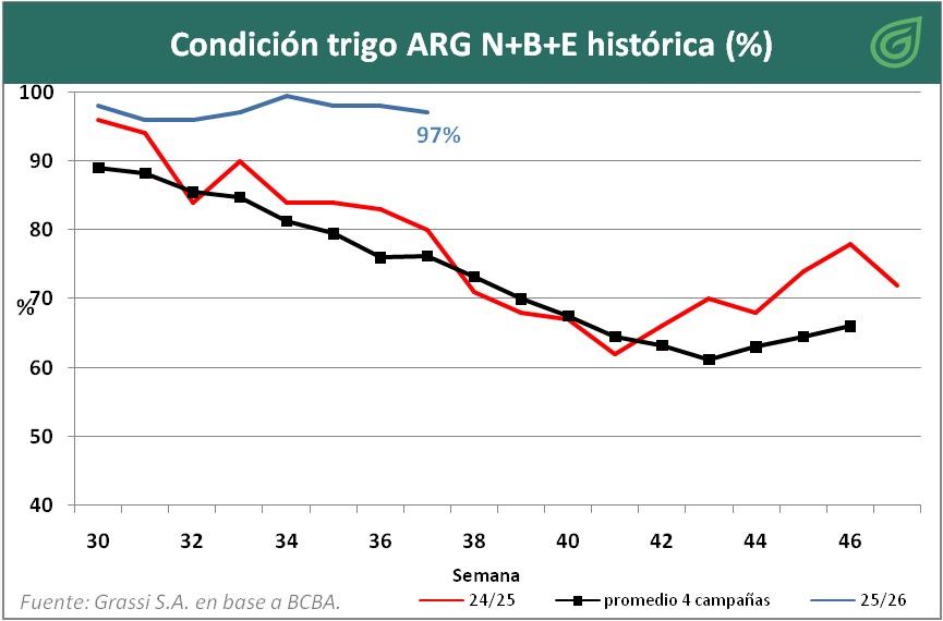 Las lluvias de esta semana concentradas en la región NEA favorecen directamente al cereal que transita estadíos entre espigazón y llenado de grano en el 93% del área. Sobre el centro y sur del área, dado el exceso de disponibilidad hídrica, se amplia el uso de fungicidas. Aun así, el 97,1 % del área presenta condición de cultivo Normal a Excelente, mientras que el 54,6 % ya transita estadíos críticos (desde encañazón en adelante) manteniendo elevadas expectativas para el cereal en términos productivos.