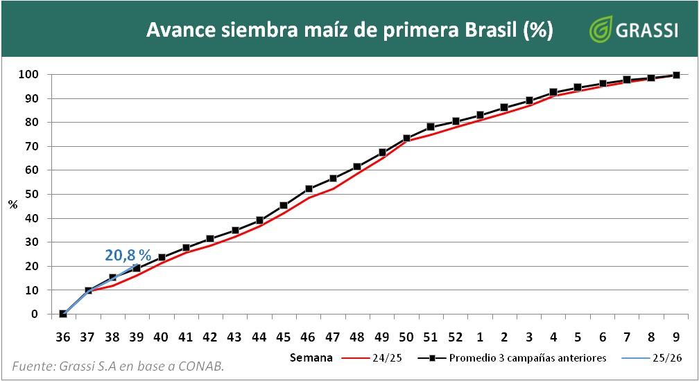 Avanza la siembra de maíz de primera con un avance de 20,8% liderado, al igual que la semana pasada, por Rio Grande Do Sul, Santa Catarina y Paraná. Las primeras regiones se encuentran adelantadas respecto al promedio de las últimas campañas mientras que Paraná está 2% atrasada.