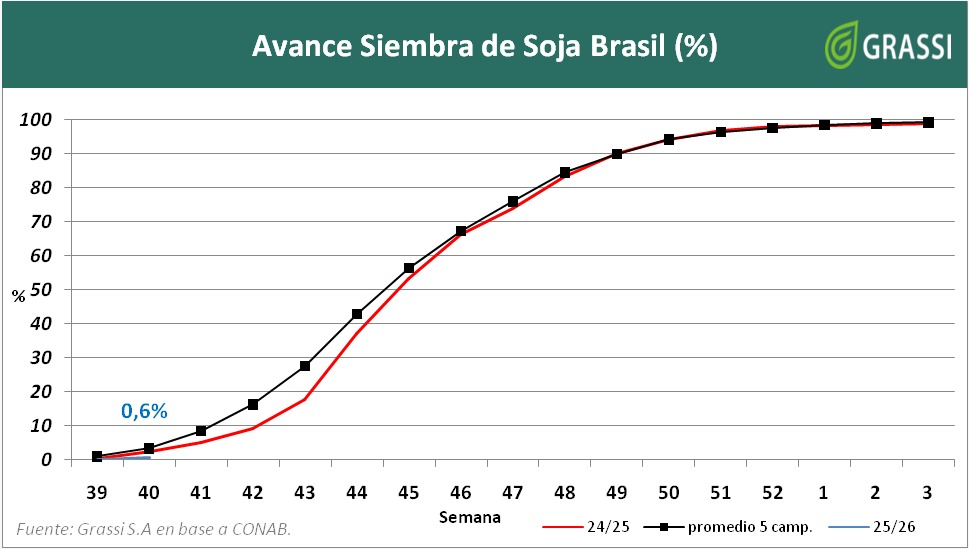 Comienza la siembra de soja, avance de 0,6%. Encabezado por Mato Grosso, Mato Grosso do Sul y Paraná. 0,4% adelantado con respecto a la campaña pasada y atrasado en el mismo valor con respecto al promedio de las ultimas 5 campañas.