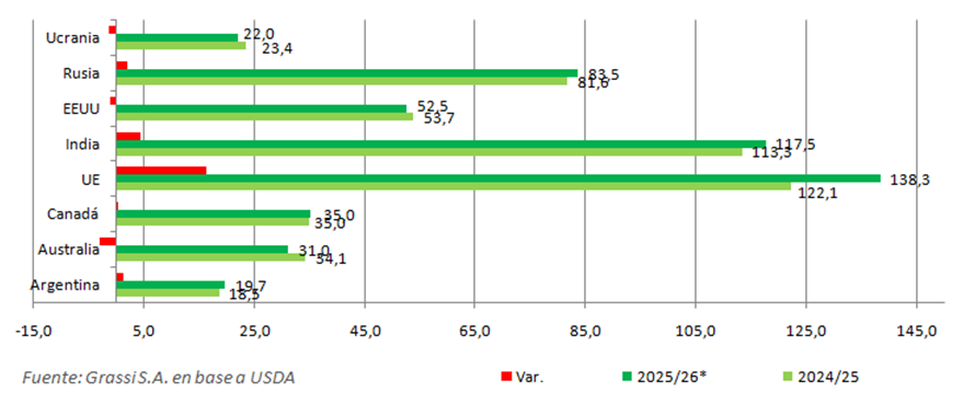 A nivel global, también se proyecta una oferta abundante de trigo. Los principales países productores —entre ellos Rusia, India, Argentina y los miembros de la Unión Europea— alcanzarían volúmenes superiores a los de la campaña pasada, conformando así la mayor oferta de las últimas cuatro campañas.