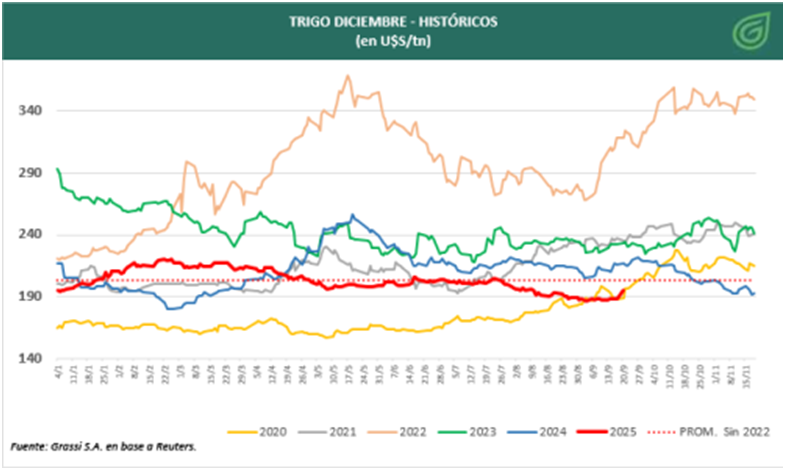 Volveremos al escenario local, pero para analizar detenidamente la posición futura diciembre 2025 del trigo. Hasta hace algunas semanas, sus valores se encontraban considerablemente por debajo del promedio histórico. Sin embargo, tras la reciente medida del Gobierno de suspender temporalmente las retenciones, el precio se ha acercado al rango habitual, otorgándole mayor atractivo para los productores.