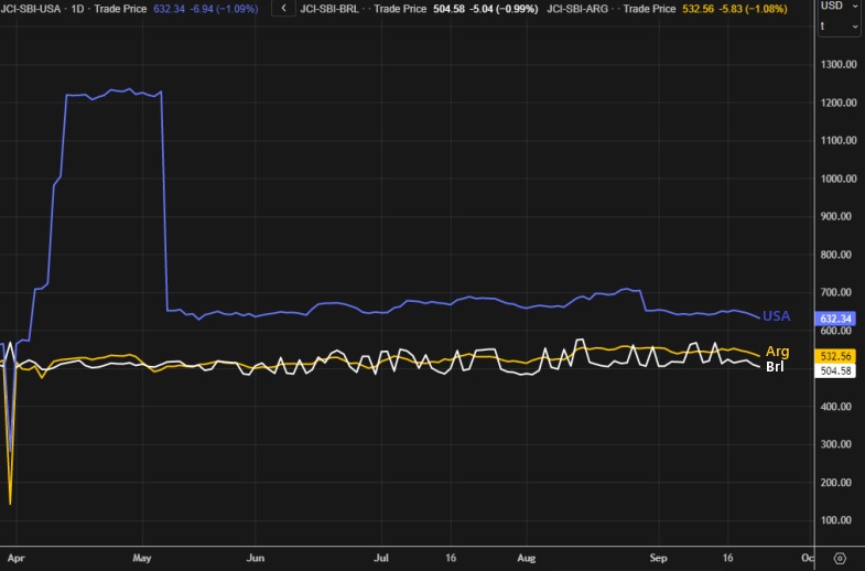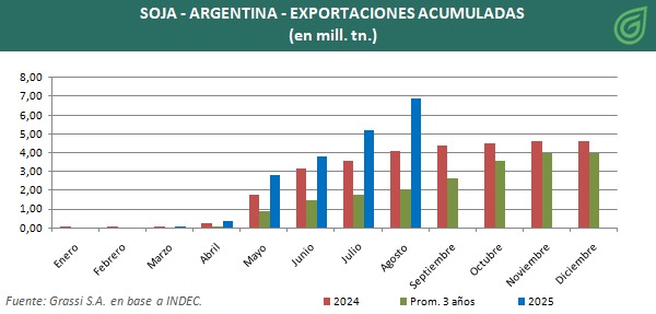 La campaña en Argentina, exhibe un volumen atípico de exportaciones de poroto proyectadas en la hoja de balance, en 9 mill. tn. Hasta Agosto, ya van 7 mill. tn. Esto sugiere un mercado que podría mantenerse tirante o competitivo entre fábricas vs. exportación para originar poroto hasta fin de año.