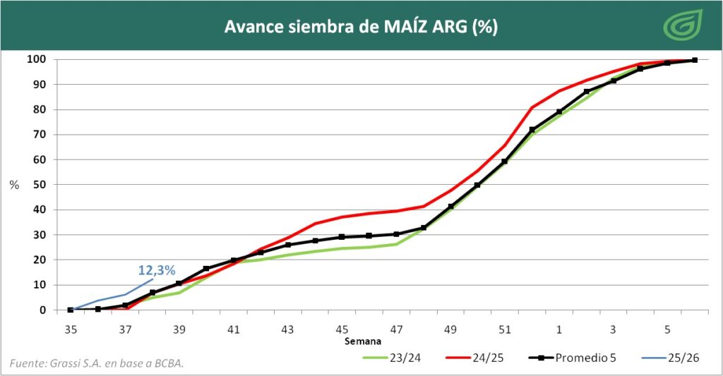 Con destino grano avanzó satisfactoriamente registrando un progreso intersemanal de 6,1 puntos porcentuales alcanzando el 12,3% del total estimado para esta campaña. Se estima que ya se implantaron 1.000.000 de hectáreas frente a las 700.000 hectáreas que se habían sembrado a esta altura el año pasado. Córdoba, Santa Fe y Entre Ríos registran adelantos interanuales, en la provincia de Buenos Aires persisten los excesos hídricos que dificultan la siembra.