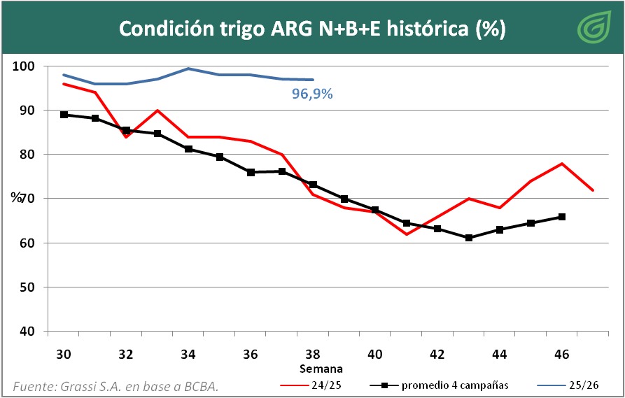 El 70,9% de las 6,7 MHa estimadas transita desde encañazón en adelante. El 81,7% del cereal mantiene condición hídrica Adecuada/Óptima y el 96,9% presenta condición de cultivo Normal/Excelente. La disponibilidad de humedad resulta particularmente favorable sobre todo en el centro y norte del área agrícola, sin embargo, los excesos hídricos sobre el oeste y centro bonaerense podrían interrumpir el avance de las labores.
