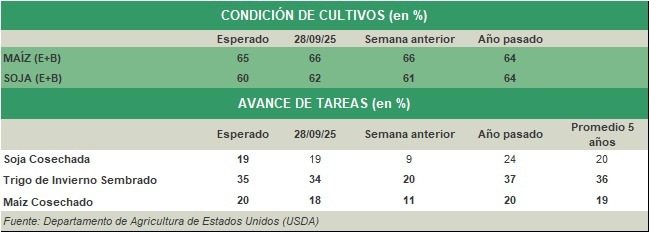 Continuamos el seguimiento de las condiciones para la oleaginosa, (E+B) las cuales fueron 62%, por encima de lo que esperaba el mercado, 1% arriba de la semana anterior y atrasada respecto al año pasado.