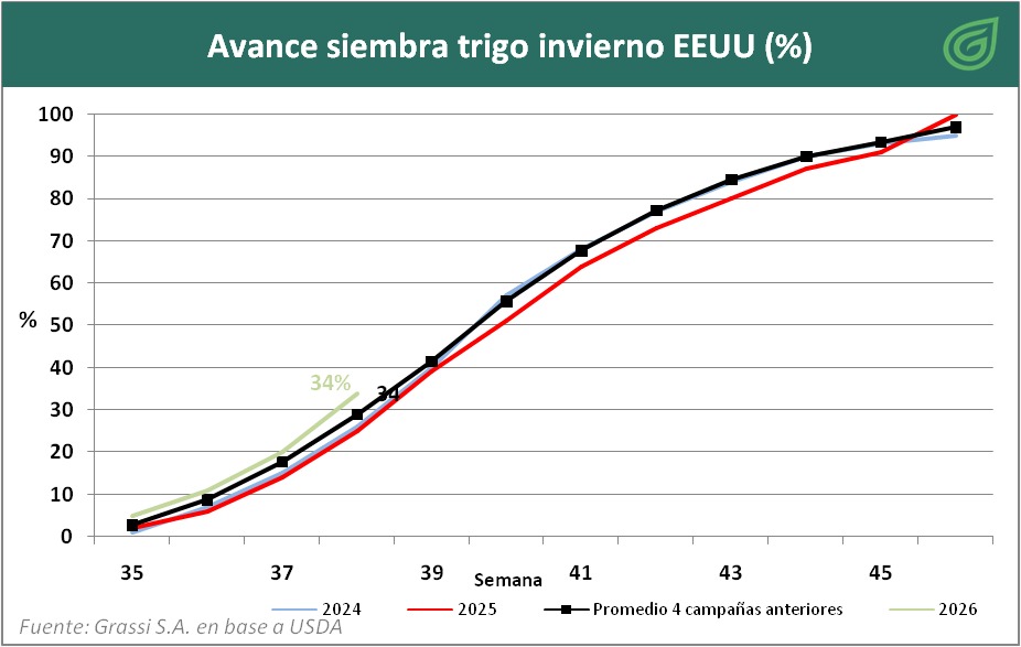 La siembra para el cultivo de invierno tiene un avance de 34%, un 1% atrasado con respecto a la expectativa del mercado, atrasado respecto al año pasado y al promedio de 5 años.
