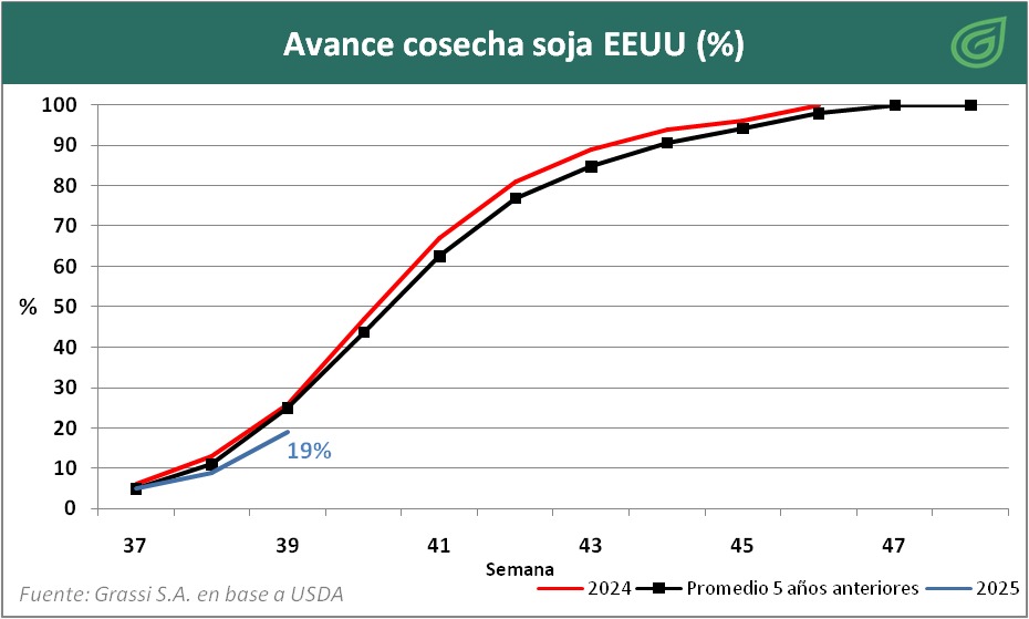 Con respecto a la cosecha de soja, hay un avance de 19%, igual a lo esperado pero atrasado con respecto al año pasado y al promedio de los 5 años.