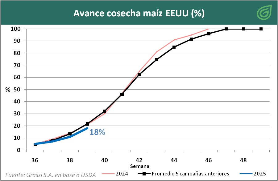 Avanza la cosecha de Maíz, 18% de avance, 2% atrasado con respecto a lo esperado y al año pasado.