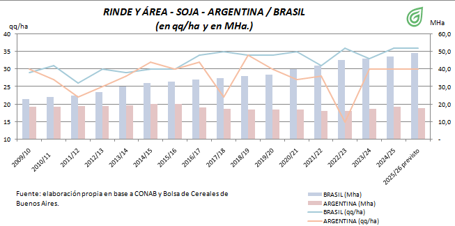 Es realmente impresionante la evolución en la producción de Soja que tuvo el país vecino los últimos 15 años. La producción paso de 68 mill. de toneladas en la campaña 2009/2010 a poco más de 178 mill. de lo previsto para la campaña 2025/2026. Esta importante variación, se explica por el aumento del área sembrada en Brasil que paso de poco más de 23 millones de hectáreas utilizadas para la oleaginosa e la campaña 2009/2010, a cerca de 50 millones de hectáreas para la campaña 2025/2026. En 15 años más que se duplico el área sembrada y la producción.