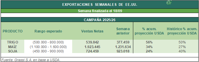 Si bien los datos se encuentran algo desactualizados, producto del cierre temporal del Dpto. de Agricultura de EE.UU., podemos ver claramente como el porcentaje de exportaciones norteamericanas para la campaña 2025/2026 en Soja, se encuentran atrasadas. Más específicamente, un 16p.p. en relación al promedio histórico.