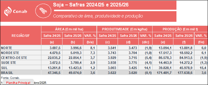 En concreto, los mayores incrementos en área se dan en las regiones del Norte de Brasil y el Nordeste: 8,1% y 7,3% respectivamente. Sin embargo, juntas representan un 18% aproximadamente de la producción total. Por otro lado, la región Sur de Brasil aumenta 14% sus rendimientos y, en la campaña 25/26, estaría explicando el 26% de la producción aproximadamente.