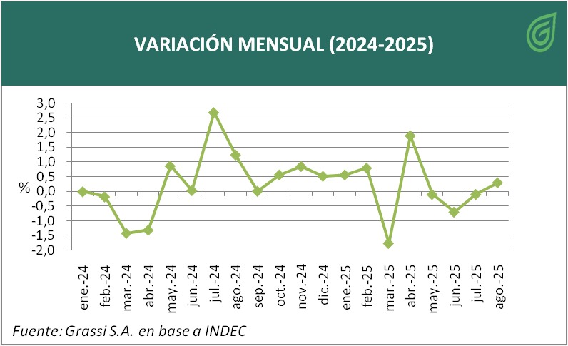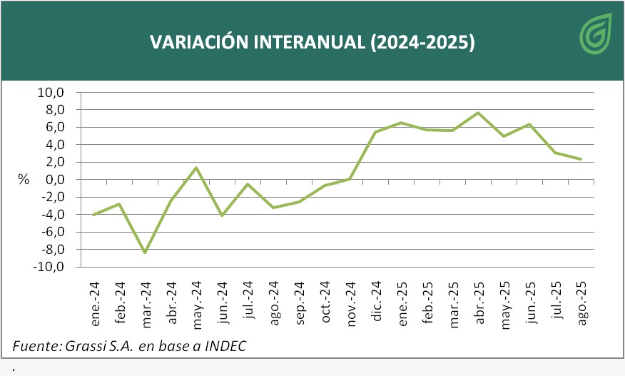 En Agosto de 2025, el estimador mensual de actividad económica (EMAE) se incrementó 2,4% respecto al mismo mes de 2024.