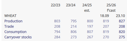 En primer lugar, el IGC (International Grains Council) corrigió sus números de producción para el ciclo 2025/2026. El mismo pasó de 819 mill. tn. A 827 mill. tn. Asimismo, los stocks finales pasaron de 270 a 275 mill. tn. La ruta marca un futuro con amplia dotación de Trigo a nivel mundial. Ahora bien, la demanda también sufre modificaciones, pero ligeras. En tal sentido, el ratio stock consumo pasa de 33% para la campaña 24/25 a 33,5% en 25/26. La variación en la demanda prácticamente es de magnitud similar frente a los stocks finales.