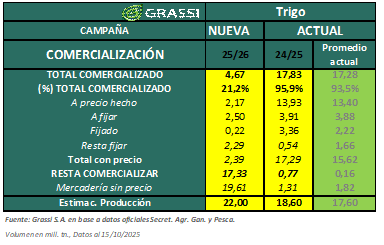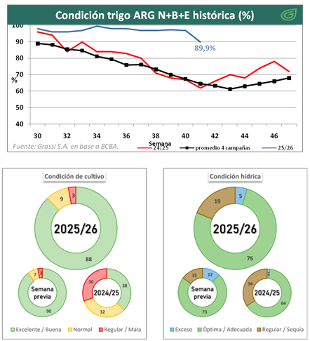 En definitiva no solo por el plano local, sino por el contexto internacional, no deberíamos preocuparnos por la oferta de trigo. Los suministros son altos, las perspectivas para el avance de tareas podría acompañar en general a los países competidores, y la demanda podría mostrarse activa. En un contexto de amplia oferta global de trigo para el ciclo 2025/2026, con precios en mínimos históricos y perspectivas de cosechas firmes en países clave, la comercialización enfrenta un entorno competitivo. Aprovechar las buenas condiciones del trigo local (88% en condición excelente/buena) y la ventana de oportunidad previa a la saturación del mercado puede maximizar el valor de las estrategias comerciales en un escenario de abundancia.