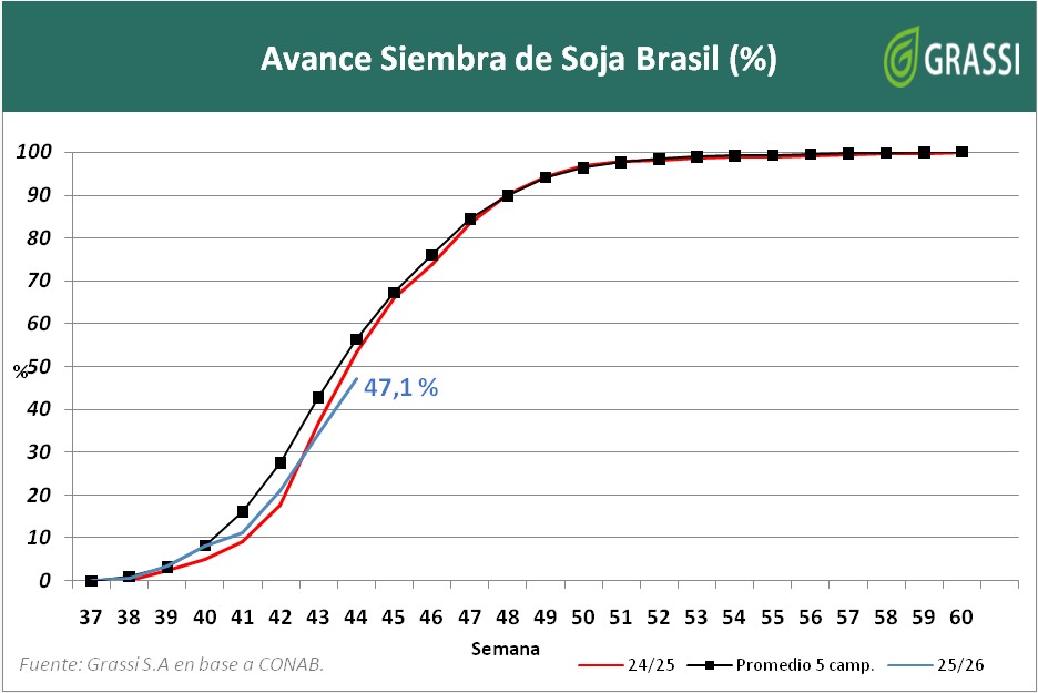 Gran avance de la siembra de soja con respecto a la semana pasada, 47,1% total. Atraso de 6 p.p. con respecto a la campaña pasada y, al igual que la semana pasada, 8 p.p. atrasada con respecto al promedio de las ultimas 5 campañas.