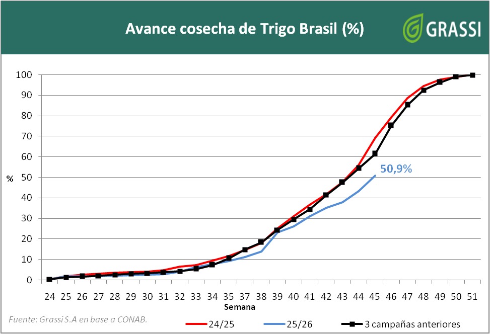 Continua la cosecha de trigo con un avance de 50,9%, bastante atrasada: 18,4 p.p. en relación a la campaña pasada y 9,2 p.p. con respecto al promedio de las ultimas 5 campañas.