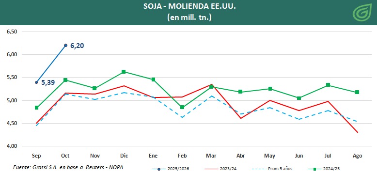 De acuerdo a los datos de NOPA, la molienda mensual en Octubre se ubicó en 6,2 mill. tn. significando un récord histórico. Se superó la marca del mes anterior y además se ubicó muy por encima de lo que esperaba el mercado (5,7 mill. tn).