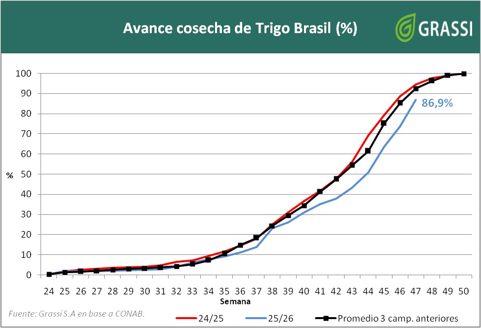 Continua la cosecha de trigo con un avance de 86,9%. Atrasada: 7,5 p.p. en relación a la campaña pasada y 0,8 p.p. con respecto al promedio de las ultimas 5 campañas.