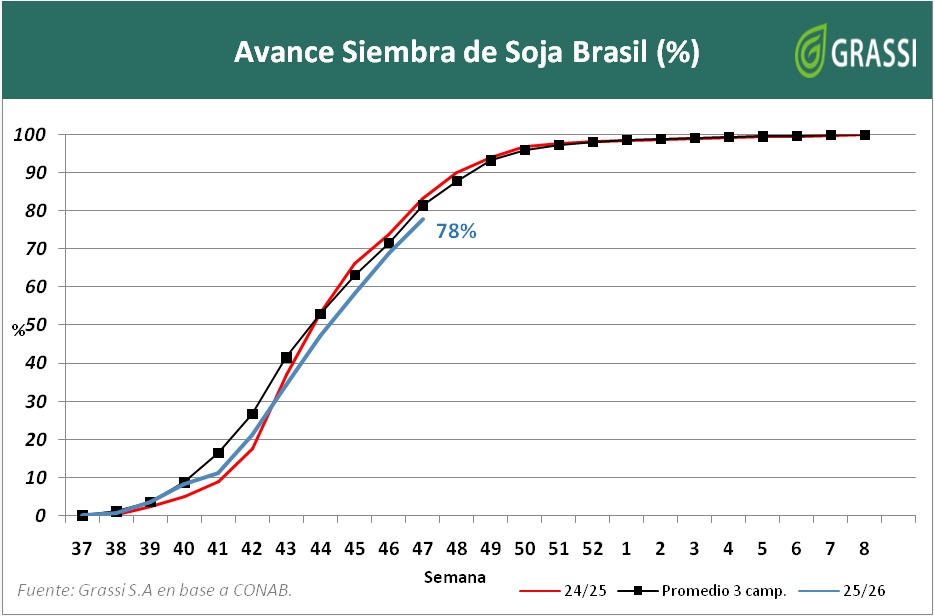 El avance de la siembra de soja es 78% total. Atrasada en 5,3 p.p. con respecto a la campaña pasada pero 2,2 p.p. adelantada con respecto al promedio de las ultimas 5 campañas.