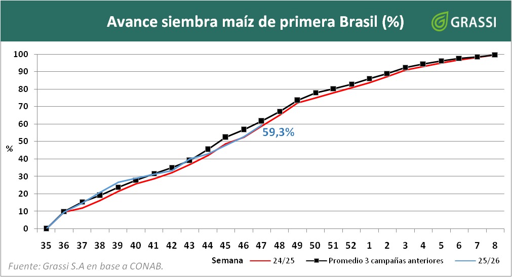 La siembra de maíz de primera presenta un avance de 59,3%, 0,6 p.p. adelantada respecto a la campaña pasada y al promedio de las ultimas 5 campañas.