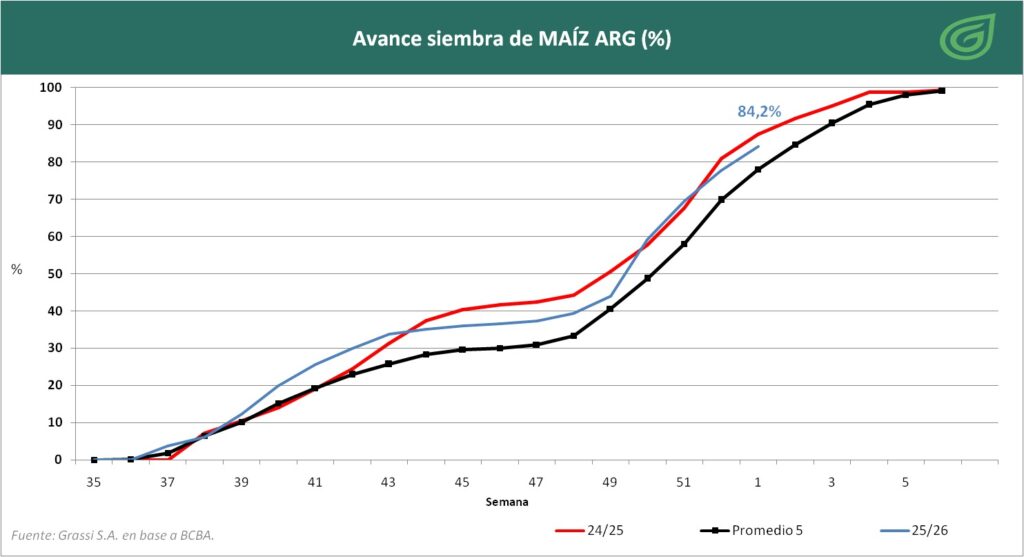 Siembra de Maíz: alcanzo el 84,2% del total estimado para esta campaña, 83,1% del cultivo se encuentra en una condición Buena/Excelente, respaldado por una oferta hídrica que continúa acompañando al cultivo en esta etapa del ciclo.