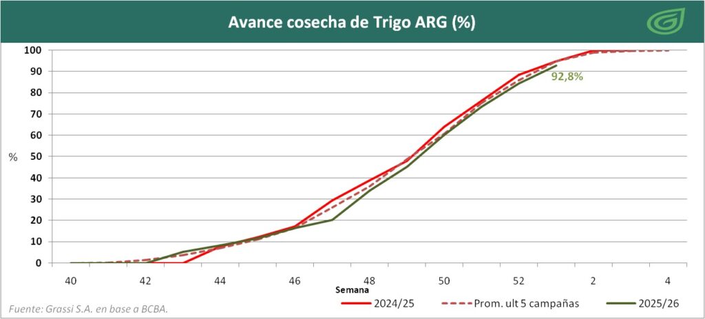 Trigo: la cosecha ya cubre el 92,8% del área apta. El rinde promedio se ubica en 43,2 qq/Ha, y el volumen recolectado asciende a 25,8 MTn. Se eleva la estimación de producción a 27,8 MTn.