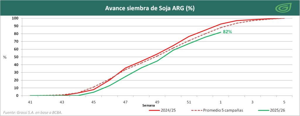 Siembra de soja: ya alcanza un 82%, las precipitaciones afectan la siembra de la región norte. El 96,1 % del área presenta una condición de cultivo Normal/Buena. En cuanto a la soja de segunda, las labores alcanzan el 71,9 % de la intención de siembra, en paralelo, el 17,3% de la soja de primera ya transita estadios reproductivos.
