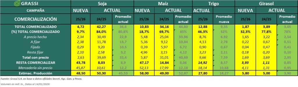 Según datos oficiales de la secretaria de Agricultura, Ganadería y Pesca en la semana del 07 al 14 de Enero se comercializaron poco más de 650.000 Tn. de trigo , 1.000.000 Tn. de maíz , 200.000 Tn. de Girasol y casi 450.000 Tn. en soja.