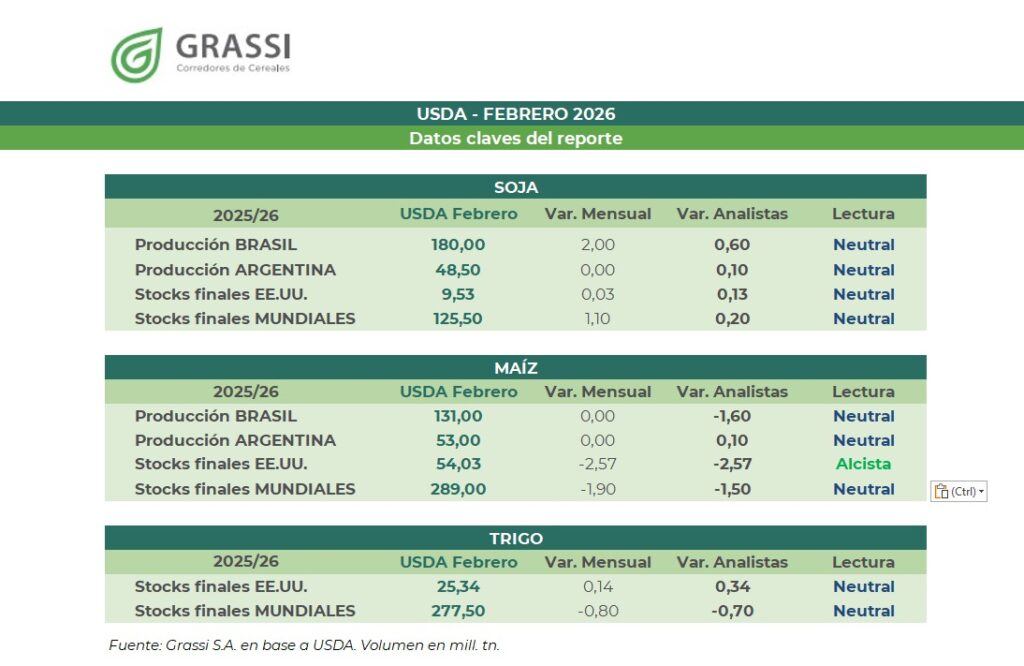 El 10 de febrero, el Departamento de Agricultura de Estados Unidos (USDA) publicó su informe mensual de estimaciones de oferta y demanda (WASDE). Los mercados agrícolas aguardaban el reporte con relativa tranquilidad, ya que en la previa, los analistas no anticipaban ajustes significativos, a diferencia de lo ocurrido el mes pasado. Finalmente, los datos no aportaron sorpresas y el mercado de Chicago (CBOT) cerró en línea con la tendencia que venía mostrando por la mañana, sin movimientos abruptos tras la publicación.