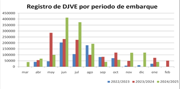 En cuanto a la dinámica comercial, los registros de DJVE de los últimos tres años muestran una marcada concentración en los meses de mayo, junio, julio y agosto, coincidiendo con el período de mayor disponibilidad del grano.