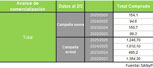Para la campaña actual, el ritmo de comercialización evoluciona de manera favorable y se ubica adelantado respecto a los últimos años, aunque todavía sin superar el nivel alcanzado en la campaña 2022/2023.