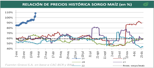 Para tener un parámetro del repunte en el cultivo, véase el precio relativo contra el maíz pizarra Rosario. Si bien es cierto que el cereal se ha debilitado, el sorgo también tuvo mejoras en su valor, lo que genera mayor poder respecto del maíz. Interesante ratio para poder generar negocios que me dejé en un mercado con mayor liquidez.