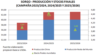 Este incremento en la demanda china se traduce en un aumento de sus importaciones, lo que empuja también al alza el comercio mundial. Como consecuencia, los stocks finales proyectados resultan menos holgados que en la campaña previa, aun con una producción global similar.