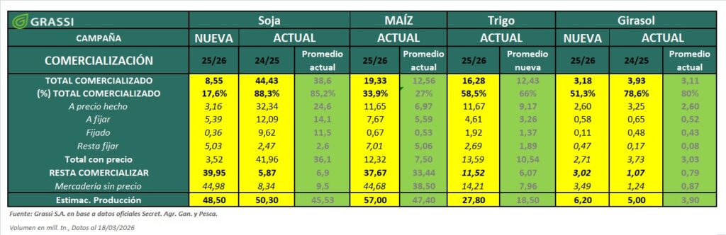 Según datos oficiales de la secretaria de Agricultura, Ganadería y Pesca en la semana del 4 al 11 de Marzo se comercializaron poco más de 228.000 Tn. de trigo, 1.700.000 Tn. de maíz , casi 1.300.000 Tn. en soja y 130.000 Tn. de Girasol.