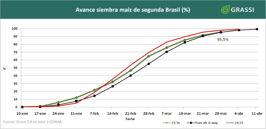 Siembra de maíz de segunda, casi finalizada en 95,5% en línea con el promedio de los últimos 5 años y 2,4 atrasada respecto al año pasado.