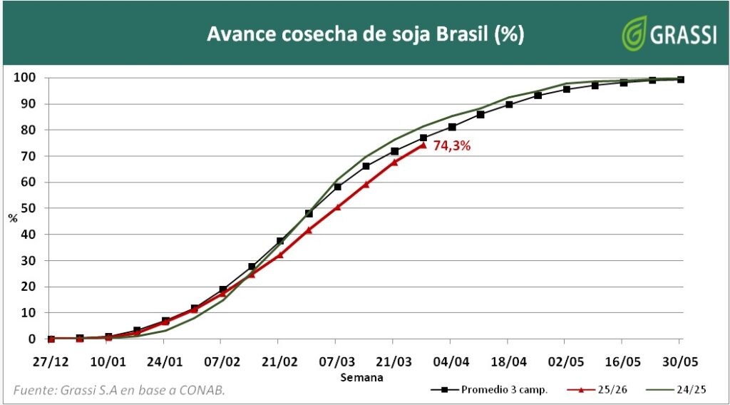 La cosecha en Brasil muestra un avance heterogéneo: en estados como Paraná, Minas Gerais, São Paulo y Goiás progresa gracias a condiciones más secas, incluso acercándose al final en algunas zonas, mientras que en Mato Grosso las condiciones sanitarias son buenas. En cambio, las lluvias retrasan las labores en Mato Grosso do Sul, Tocantins, Pará y parcialmente en Rio Grande do Sul, donde además el clima favorece los cultivos más tardíos. En el Nordeste, la cosecha avanza de forma dispar: en Bahía continúa, en Maranhão el clima es favorable en algunas regiones pero aún no inicia en otras, y en Piauí los cultivos se desarrollan bien.