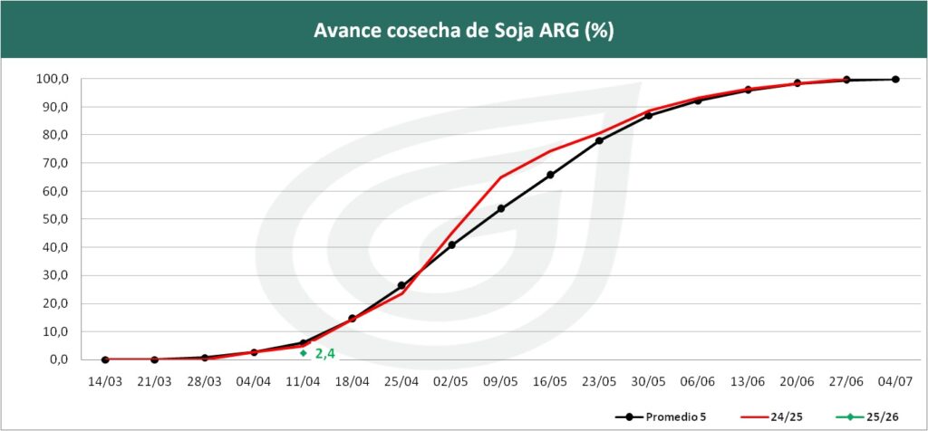 SOJA ( 48,5 Mt.) : Las lluvias demoraron la cosecha de soja, que avanza solo sobre el 2,4% del área, con rindes de 40,4 qq/Ha (Núcleo Sur), 34,6 qq/Ha (Núcleo Norte) y 39,6 qq/Ha en La Pampa-oeste bonaerense; en soja de segunda mejora la condición por mayor humedad y se mantiene la proyección en 48,5 MTn.