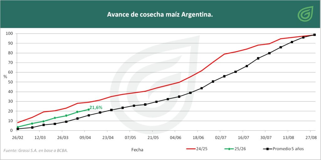 MAÍZ (57 Mt) : La cosecha de maíz avanza al 21,6% del área con un rinde promedio de 85,5 qq/Ha, aunque las lluvias recientes frenaron las labores; se destacan rindes de 99,3 qq/Ha en el Núcleo Norte y 94,3 qq/Ha en La Pampa-oeste bonaerense, mientras que el maíz tardío mejora su condición y alcanza 95 % entre Normal y Excelente.