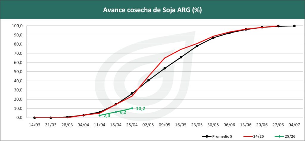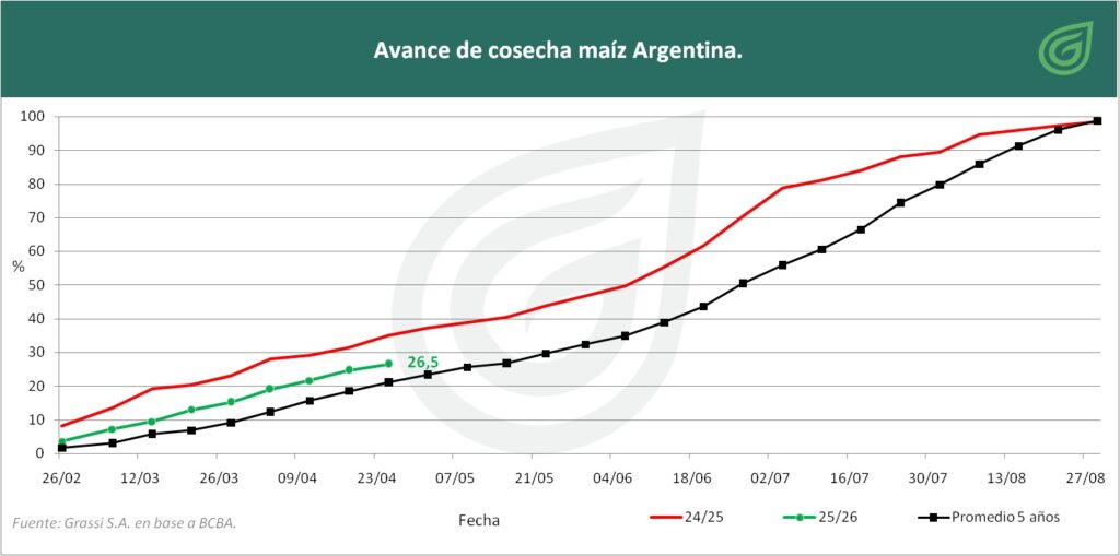 MAÍZ (61 Mt) : La cosecha de maíz avanza al 26,5% del área, con un rinde promedio de 86,9 qq/Ha, aunque las lluvias recientes demoran las labores y desplazan el foco hacia la soja. A nivel regional, los rindes alcanzan los 100 qq/Ha en el Núcleo Norte y 95 qq/Ha en el Sur. En cuanto al maíz tardío, un 30% ya está en madurez fisiológica y el resto en llenado de granos, con una condición mayormente favorable