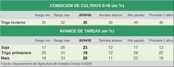Condiciones de cultivo trigo de invierno: Excelente + Bueno (E+B) fue de 30%, dentro del rango esperado por el mercado y 19 p.p. por debajo del año pasado.
